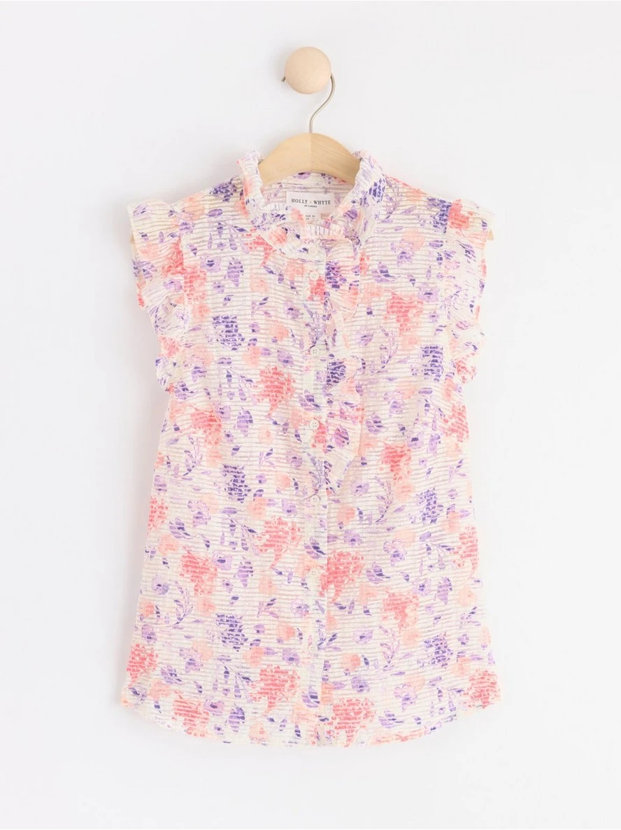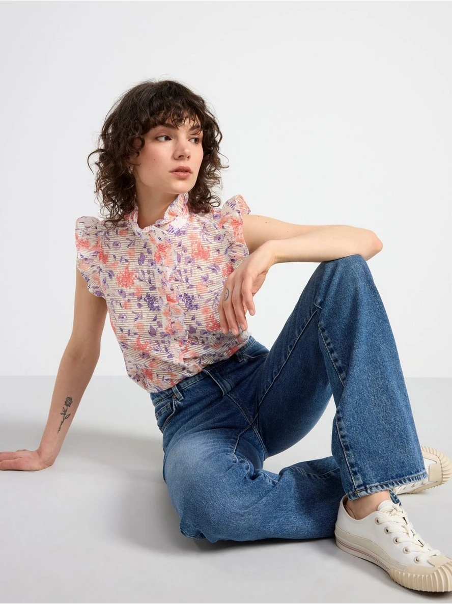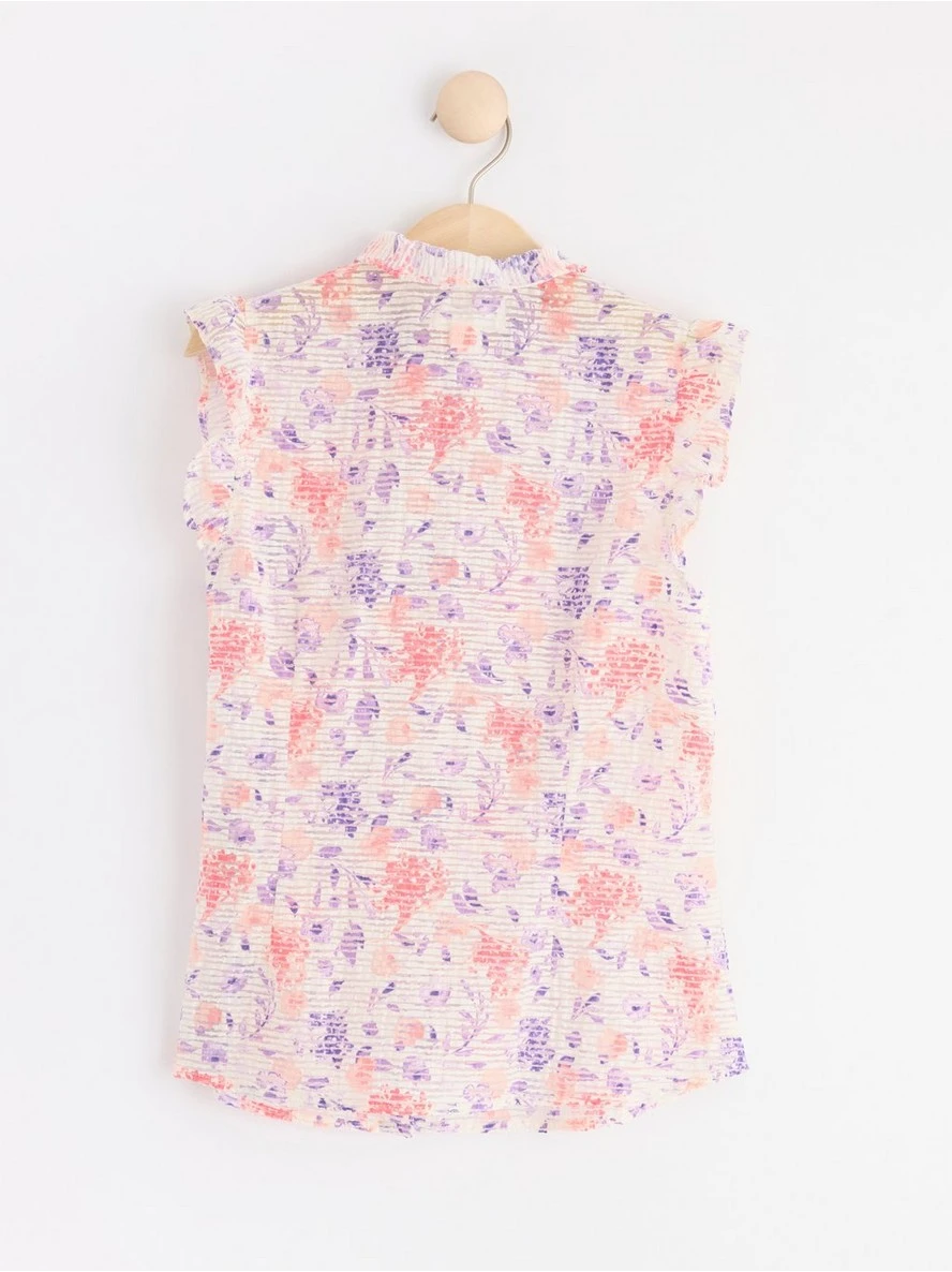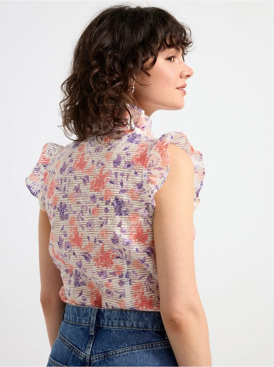 Un chemisier sans manches élégant en mélange de coton recyclé avec une texture transparente, des volants à l’ouverture des manches, à l’encolure et sur le devant. MATÉRIEL. Cette pièce est partiellement confectionnée en coton recyclé. Lorsque vous utilisez du coton recyclé, cela signifie que le coton qui a déjà été cultivé et qui aurait été gaspillé a une autre chance. C’est une culture beaucoup plus économe en ressources et en eau que la culture de nouveau coton.