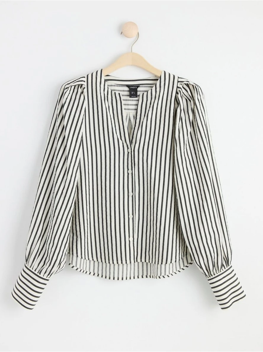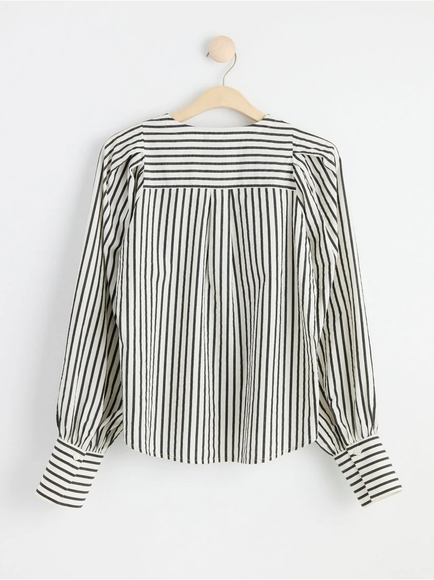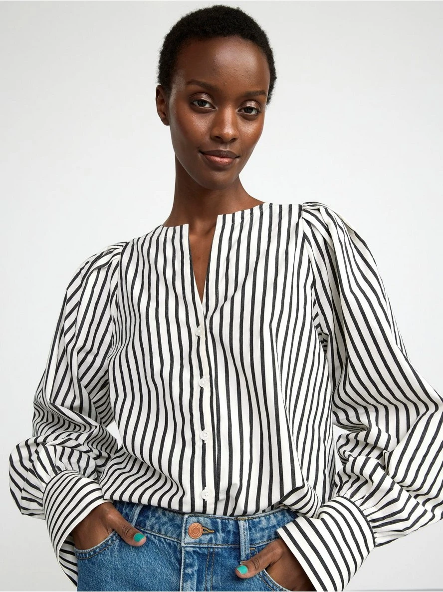 Un chemisier en coton léger avec des manches longues bouffantes, un col en V et une fermeture boutonnée sur le devant.