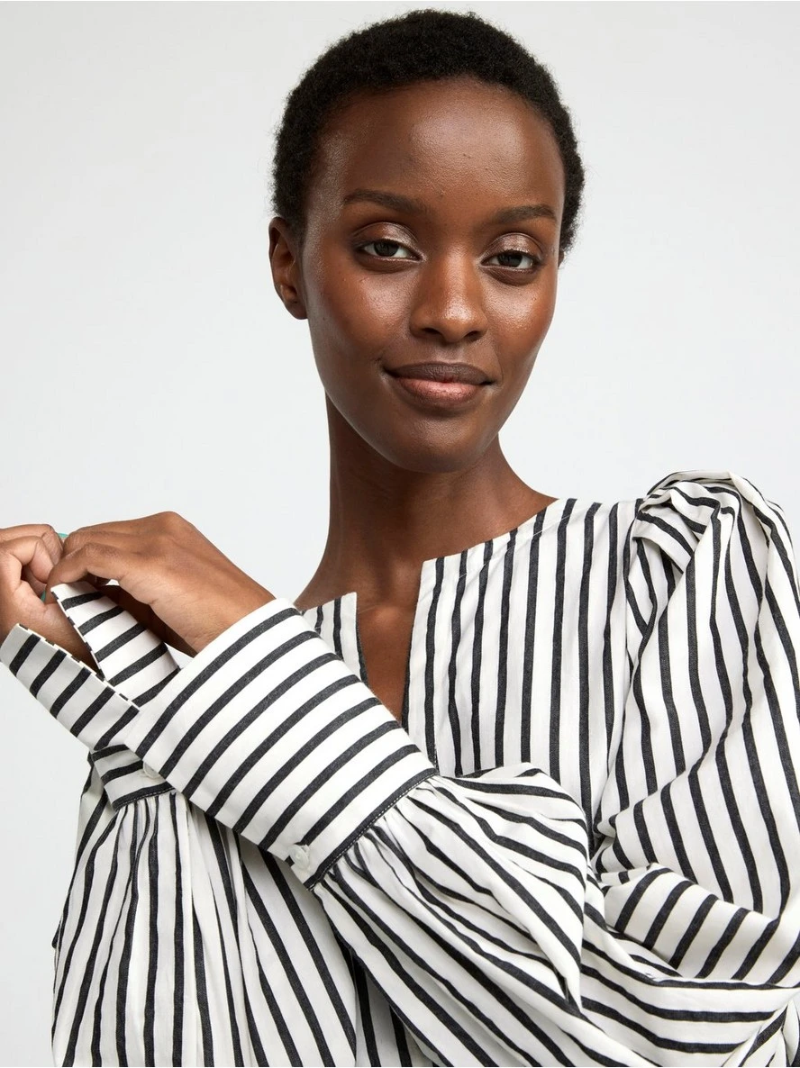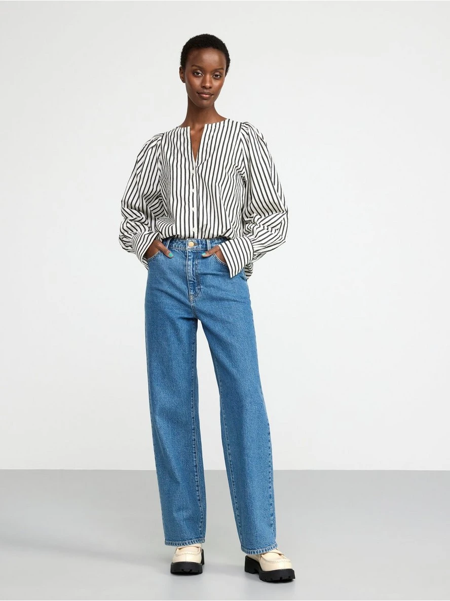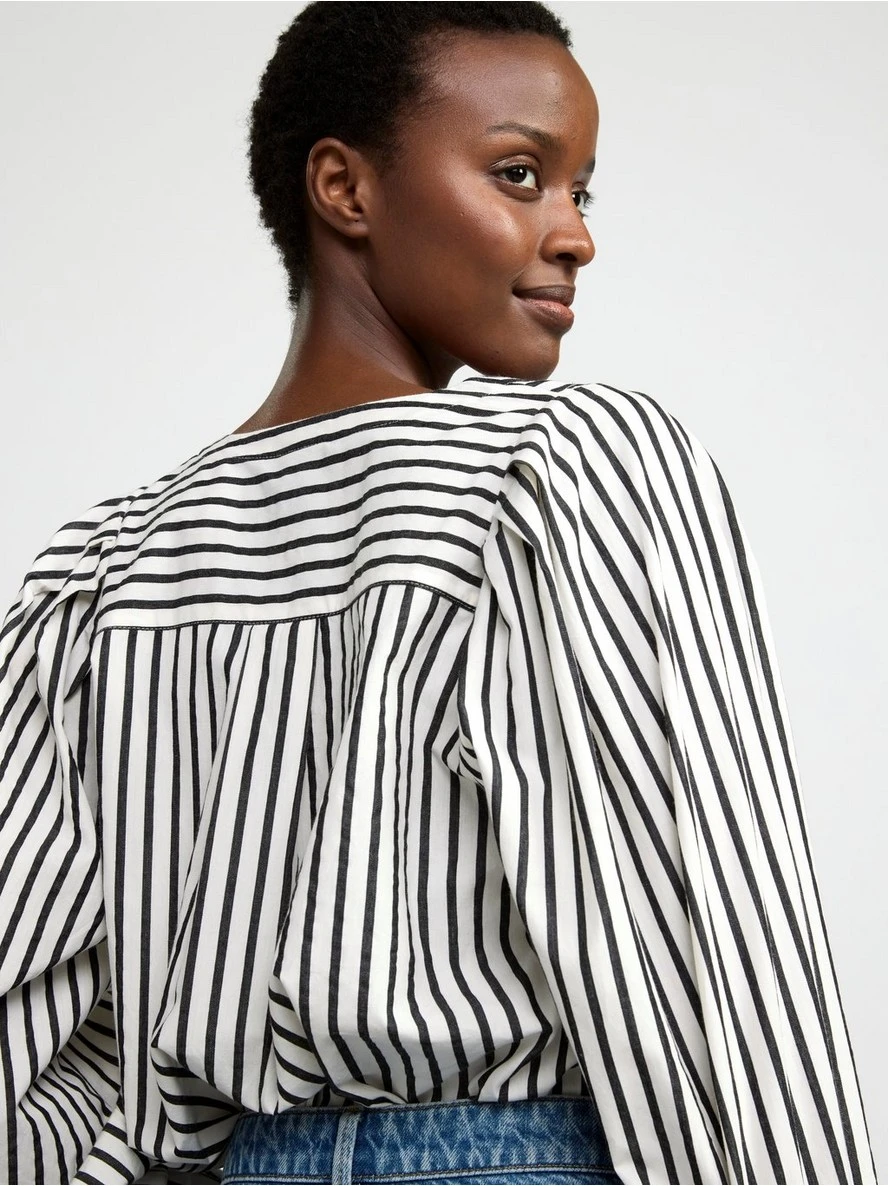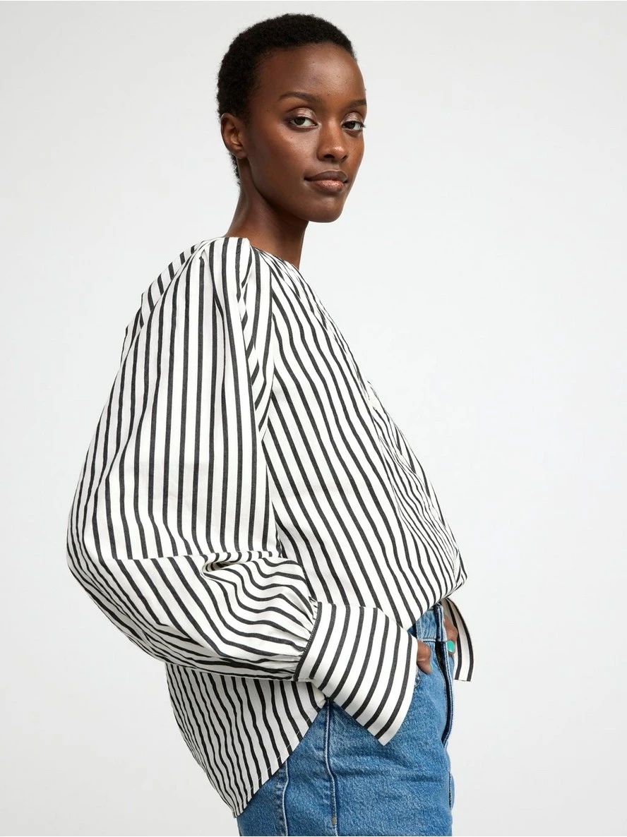 Un chemisier en coton léger avec des manches longues bouffantes, un col en V et une fermeture boutonnée sur le devant.