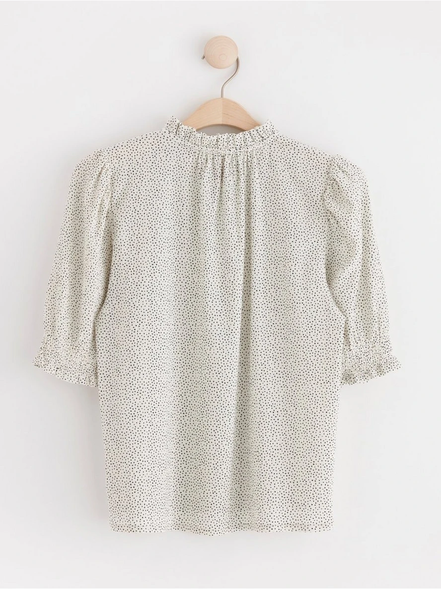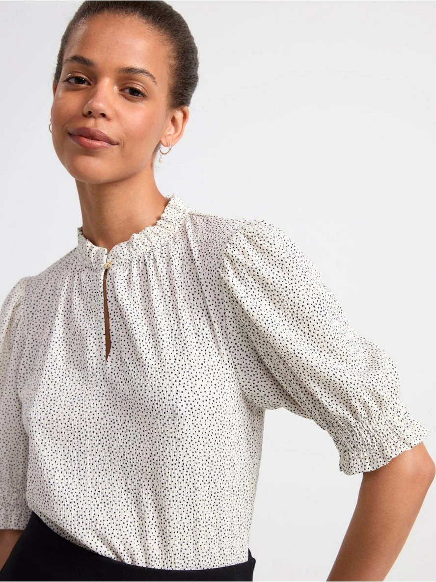 Un haut élégant avec des manches courtes bouffantes et un volant à l’encolure, confectionné dans un tissu extensible et texturé. MATÉRIEL. Cette pièce est partiellement fabriquée en polyester recyclé. L’utilisation de polyester recyclé donne une nouvelle chance à des matériaux qui ont déjà été produits, comme les bouteilles en PET. C’est beaucoup plus économe en ressources que la production de nouveaux matériaux, ce qui le rend meilleur pour l’environnement et réduit l’impact climatique.