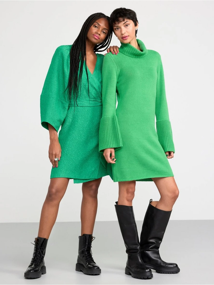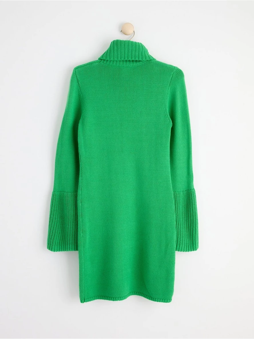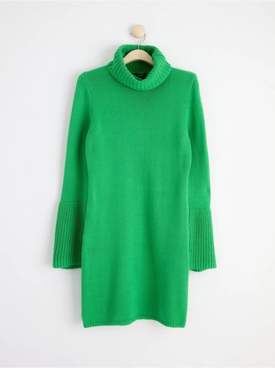 Une robe en maille douce et confortable avec un col roulé côtelé et de grosses manches évasées.