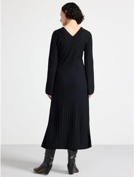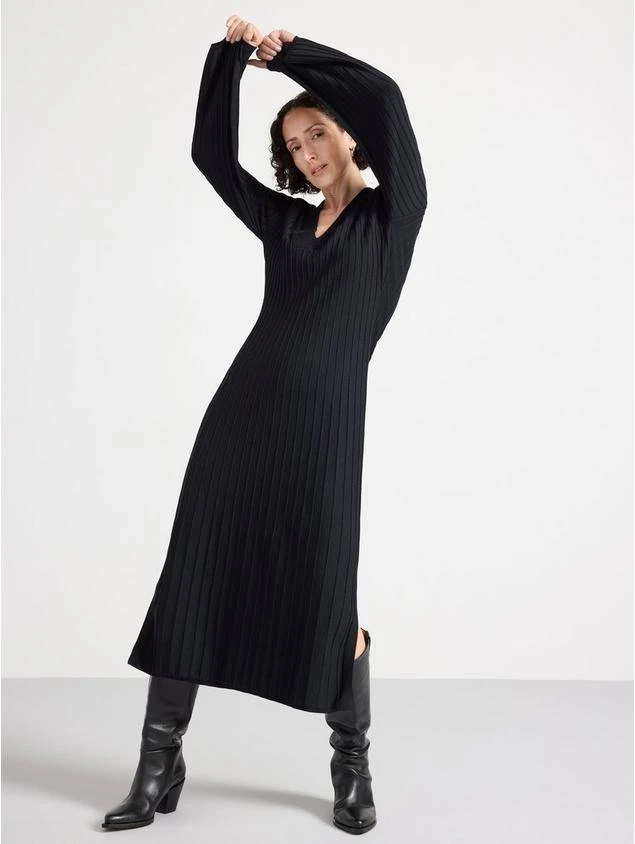 Robe longue côtelée en viscose mélangée avec manches longues et larges, col en V et silhouette ajustée. La robe longue a des fentes latérales.