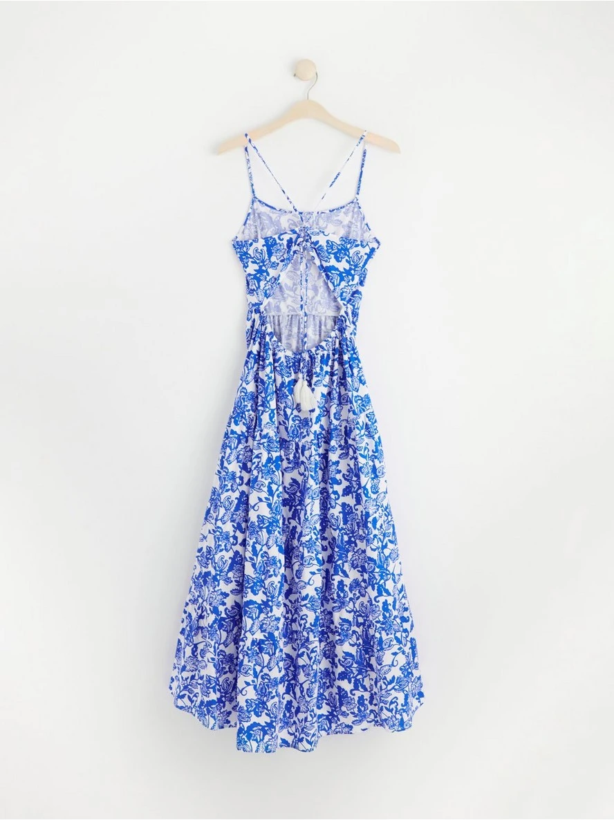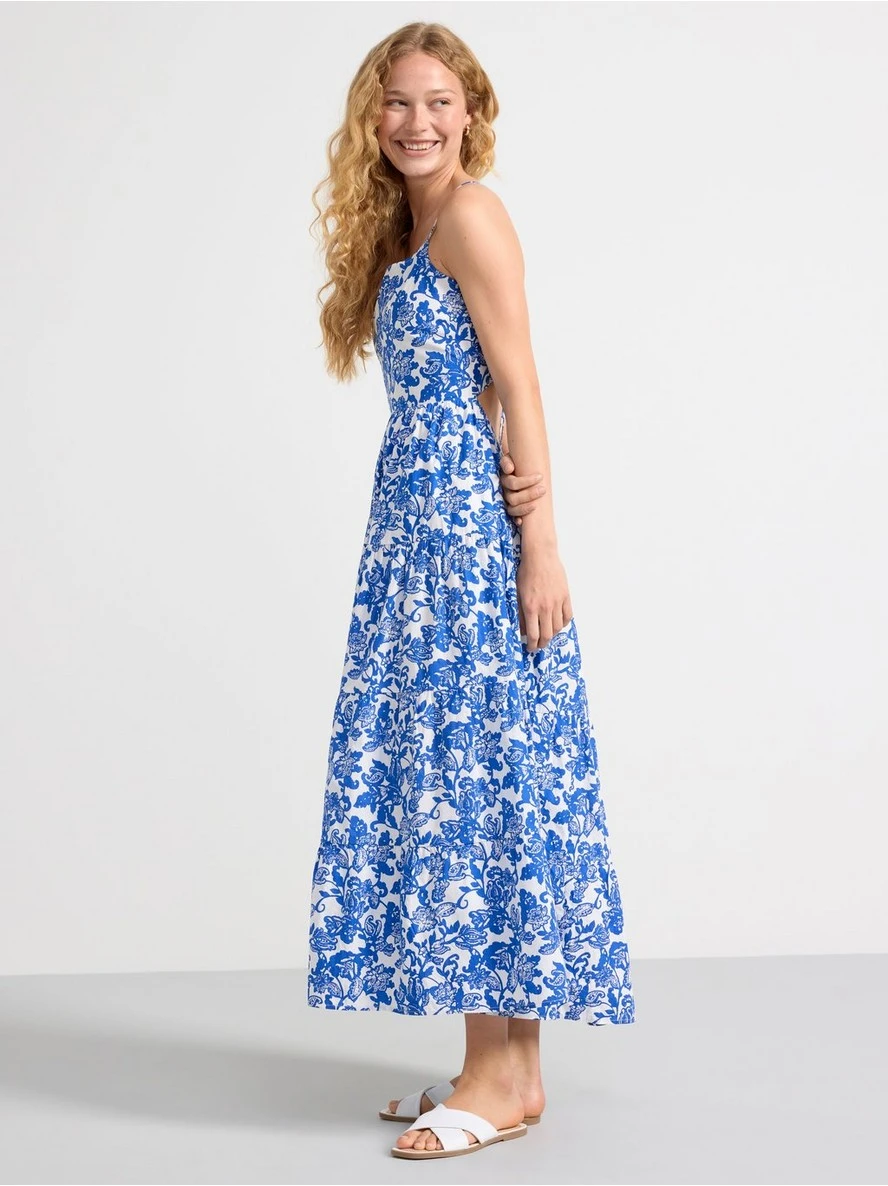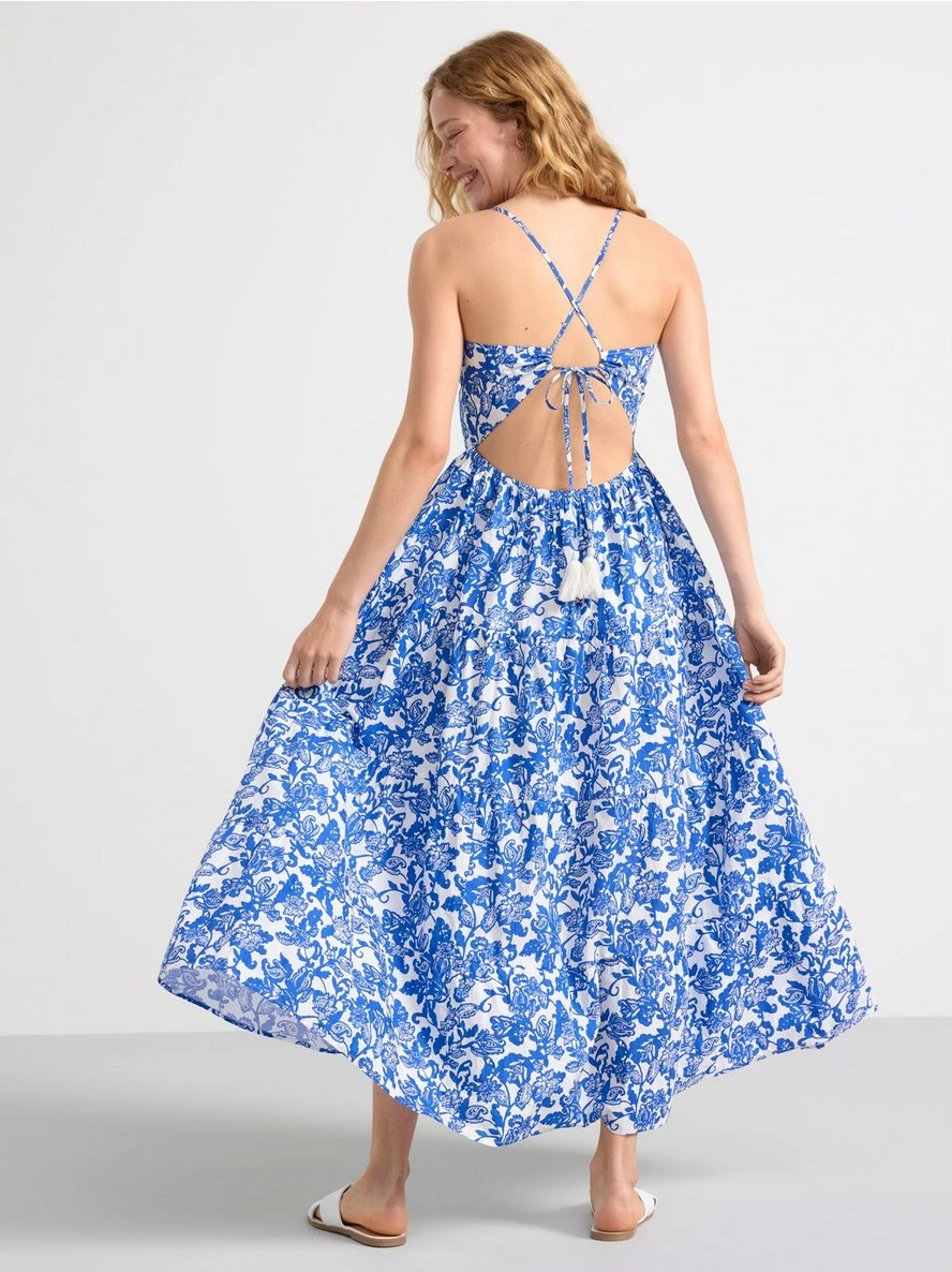 Une robe longue fluide et fleurie avec de fines bretelles et un dos ouvert.