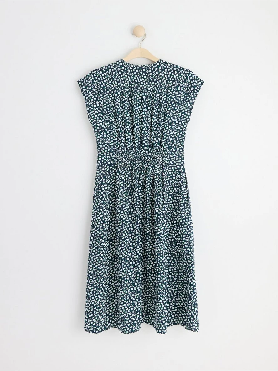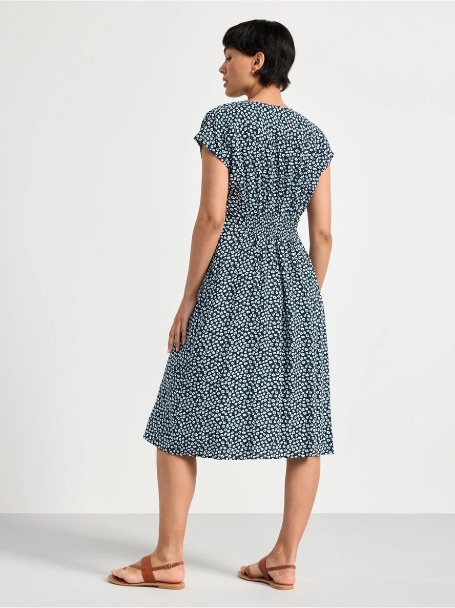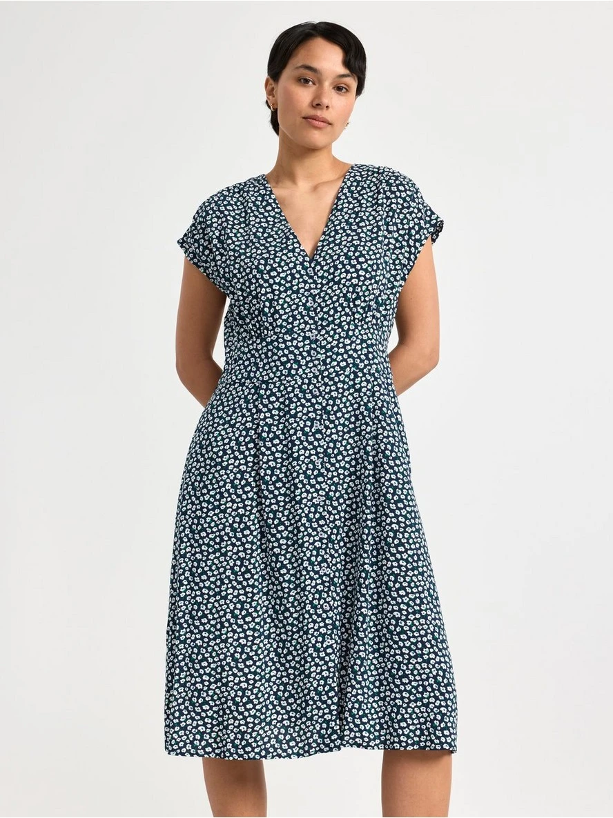 Une robe fleurie mi-longue avec des manches courtes, un col en V, des boutons sur le devant et un dos smocké. MATÉRIEL. Cette pièce est basée sur OnceMore® de Södra, une nouvelle matière première innovante en fibre de viscose, où des textiles recyclés sont combinés avec du bois issu de forêts gérées de manière responsable. OnceMore® est un matériau de haute qualité et est produit avec un impact moindre sur l’environnement par rapport aux matières premières classiques en fibre de viscose.
