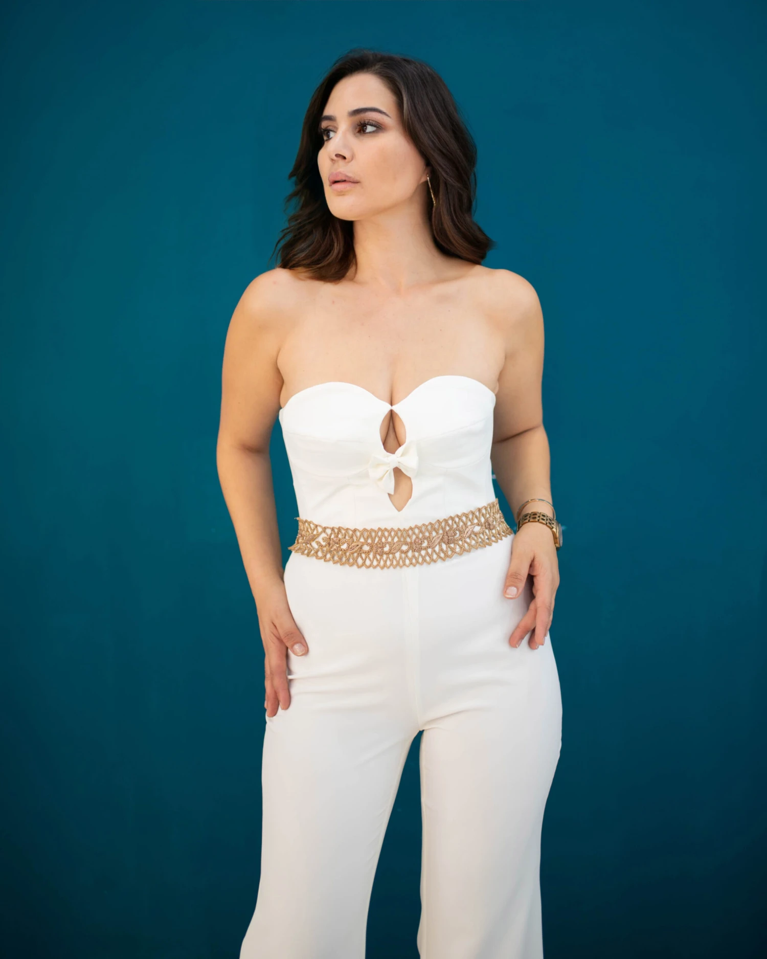 Combinaison en crêpe blanche. Haut bustier doté de deux ouvertures sur le milieu devant et un noeud papillon . Pantalon légèrement évasé