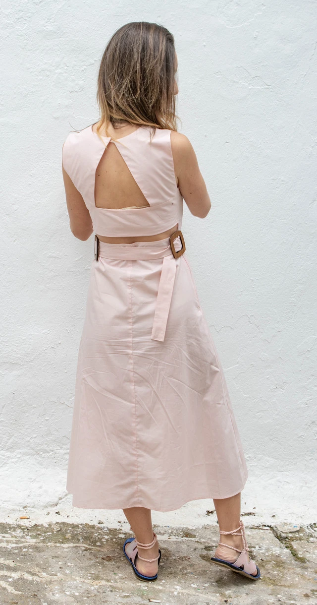 La robe Saint Trop’, en popeline de coton, fraîche et à la coupe sophistiquée, fera de vous la star de cet été ! Vous succomberez au charme du dos ajouré et des boucles qui marquent une taille bien prise!